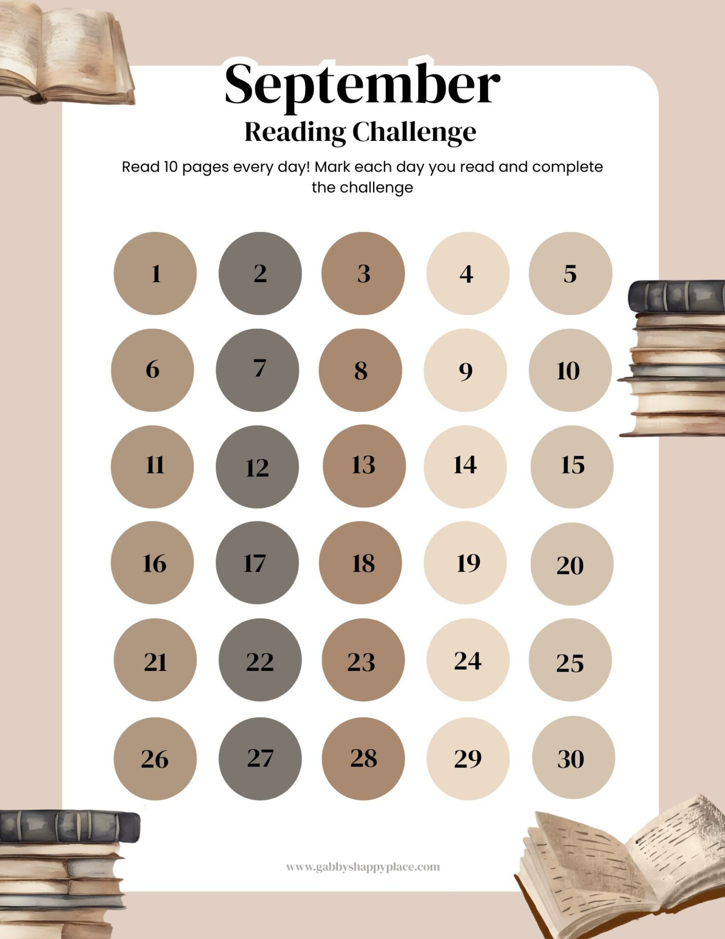 - Check off every day that you’ve completed the challenge (reading 10 pages every day).